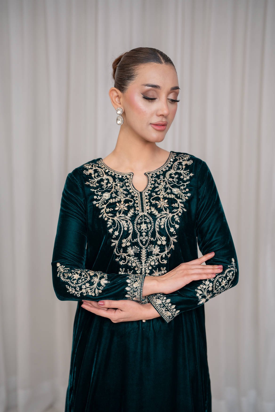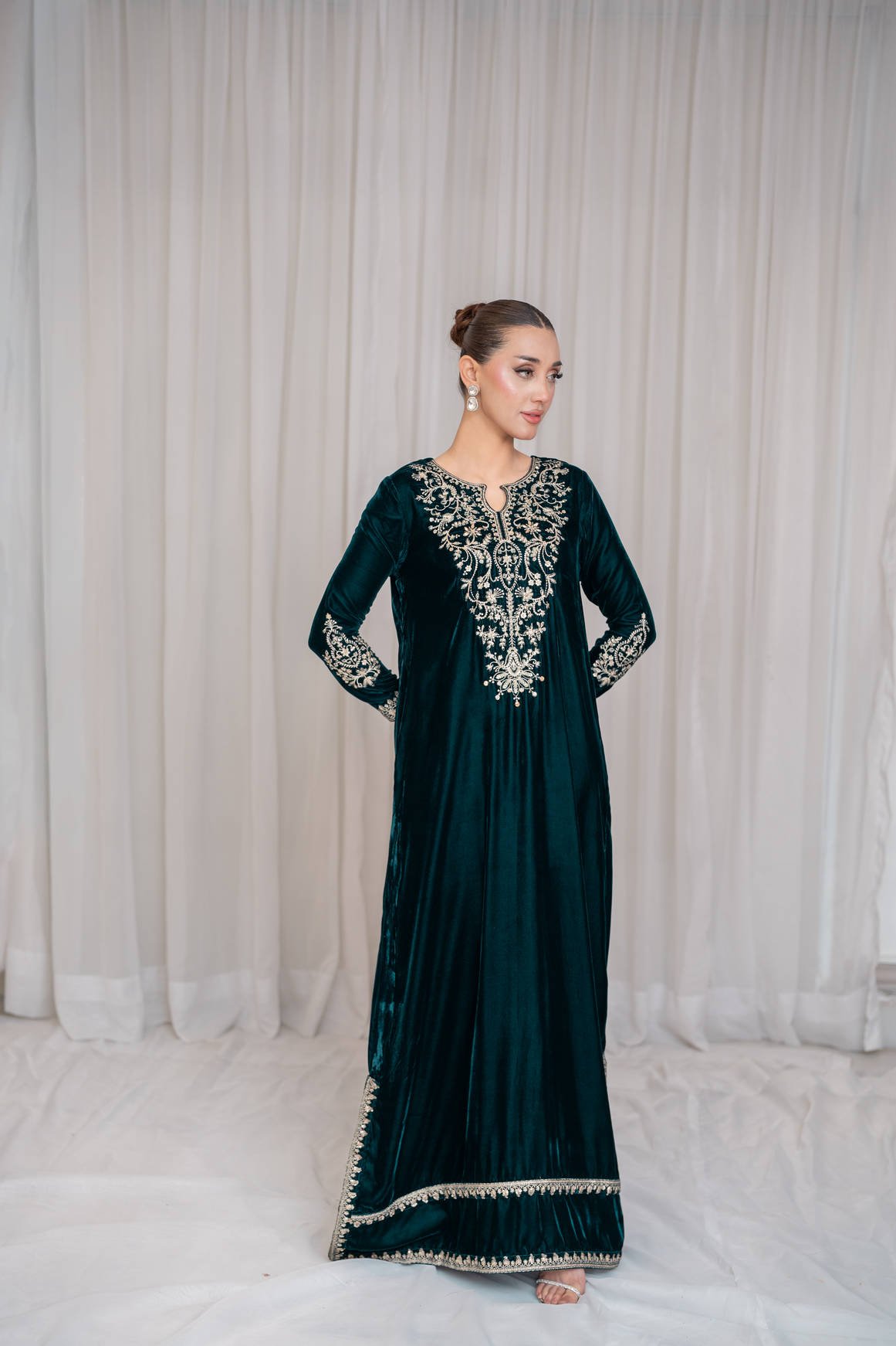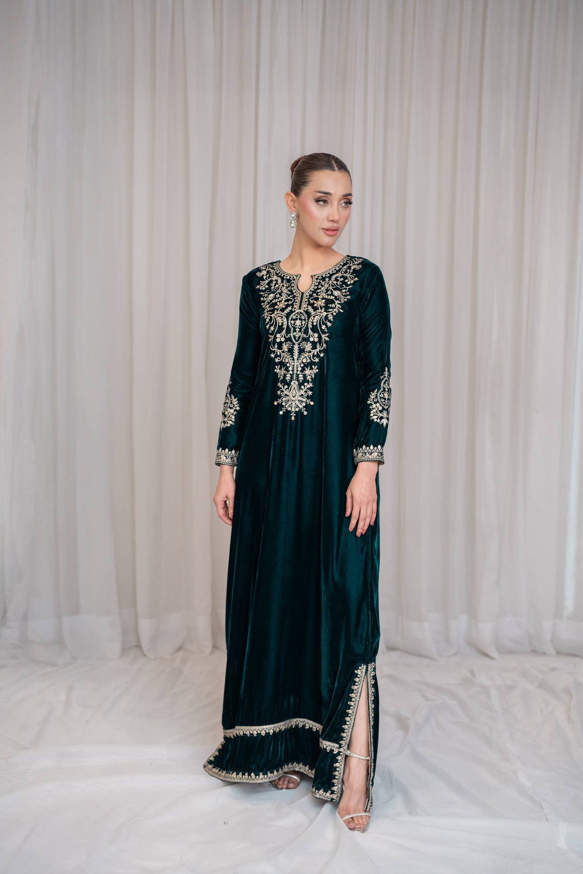A rich deep teal green kaftan shirt cut from plush velvet, featuring an intricately embroidered and embellished neckline and sleeves.